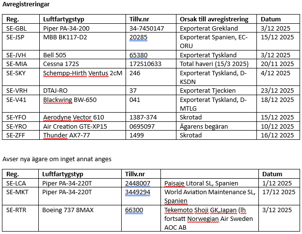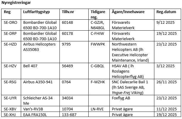 Informationen baseras som vanligt på uppgifter från Transportstyrelsen om nyregistreringar, avregistreringar och förändringar i ägare/innehavare under den här månaden. Ifall ingen innehavare anges, saknas uppgift eller så avses privatperson(er). Ändringar i ägande och/eller innehav mellan privatpersoner finns ej heller med. TS-information har kompletterats med information som finns tillgänglig på internets olika hemsidor och andra källor som till exempel Air Britain News, Scramble, SFF Forum, Aerodata, CH-Aviation, Flightradar24, Fokker News, Civil-Spotters, Rotorspot, Wikipedia etc. Tidigare registreringar anges i ordningsföljden senaste först. Förkortningen Ih (leaseholder) betyder innehavare.
