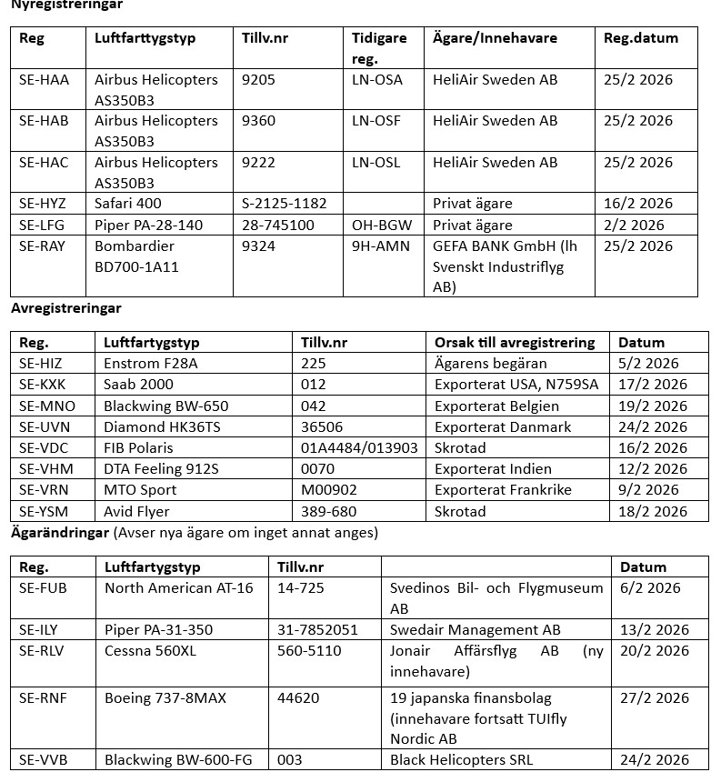 Informationen baseras som vanligt på uppgifter från Transportstyrelsen om nyregistreringar, avregistreringar och förändringar i ägare/innehavare under den här månaden. Ifall ingen innehavare anges, saknas uppgift eller så avses privatperson(er). Ändringar i ägande och/eller innehav mellan privatpersoner finns ej heller med. TS-information har kompletterats med information som finns tillgänglig på internets olika hemsidor och andra källor som till exempel Air Britain News, Scramble, SFF Forum, Aerodata, CH-Aviation, Flightradar24, Fokker News, Civil-Spotters, Rotorspot, Wikipedia etc. Tidigare registreringar anges i ordningsföljden senaste först. Förkortningen Ih (leaseholder) betyder innehavare.