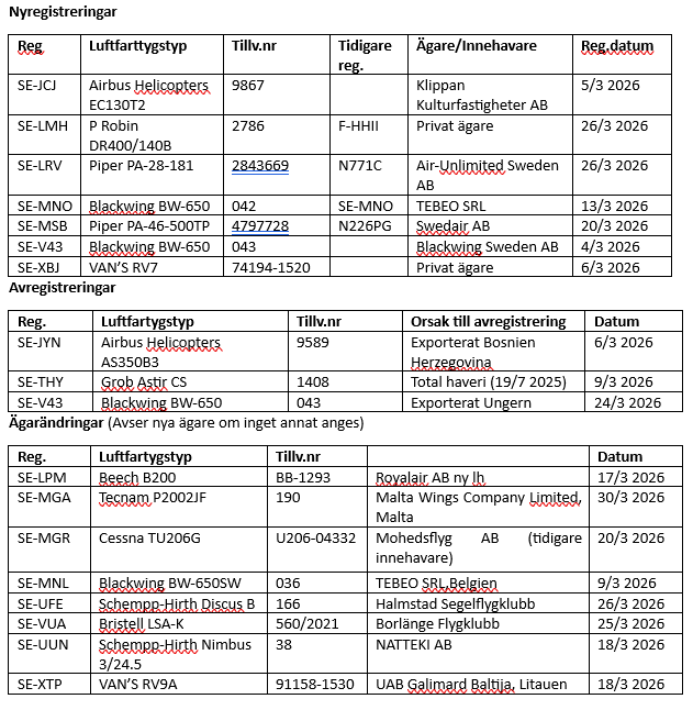Informationen baseras som vanligt på uppgifter från Transportstyrelsen om nyregistreringar, avregistreringar och förändringar i ägare/innehavare under den här månaden. Ifall ingen innehavare anges, saknas uppgift eller så avses privatperson(er). Ändringar i ägande och/eller innehav mellan privatpersoner finns ej heller med. TS-information har kompletterats med information som finns tillgänglig på internets olika hemsidor och andra källor som till exempel Air Britain News, Scramble, SFF Forum, Aerodata, CH-Aviation, Flightradar24, Fokker News, Civil-Spotters, Rotorspot, Wikipedia etc. Tidigare registreringar anges i ordningsföljden senaste först. Förkortningen Ih (leaseholder) betyder innehavare.