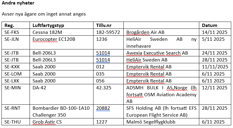 Informationen baseras som vanligt på uppgifter från Transportstyrelsen om nyregistreringar, avregistreringar och förändringar i ägare/innehavare under den här månaden. Ifall ingen innehavare anges, saknas uppgift eller så avses privatperson(er). Ändringar i ägande och/eller innehav mellan privatpersoner finns ej heller med. TS-information har kompletterats med information som finns tillgänglig på internets olika hemsidor och andra källor som till exempel Air Britain News, Scramble, SFF Forum, Aerodata, CH-Aviation, Flightradar24, Fokker News, Civil-Spotters, Rotorspot, Wikipedia etc. Tidigare registreringar anges i ordningsföljden senaste först. Förkortningen Ih (leaseholder) betyder innehavare.