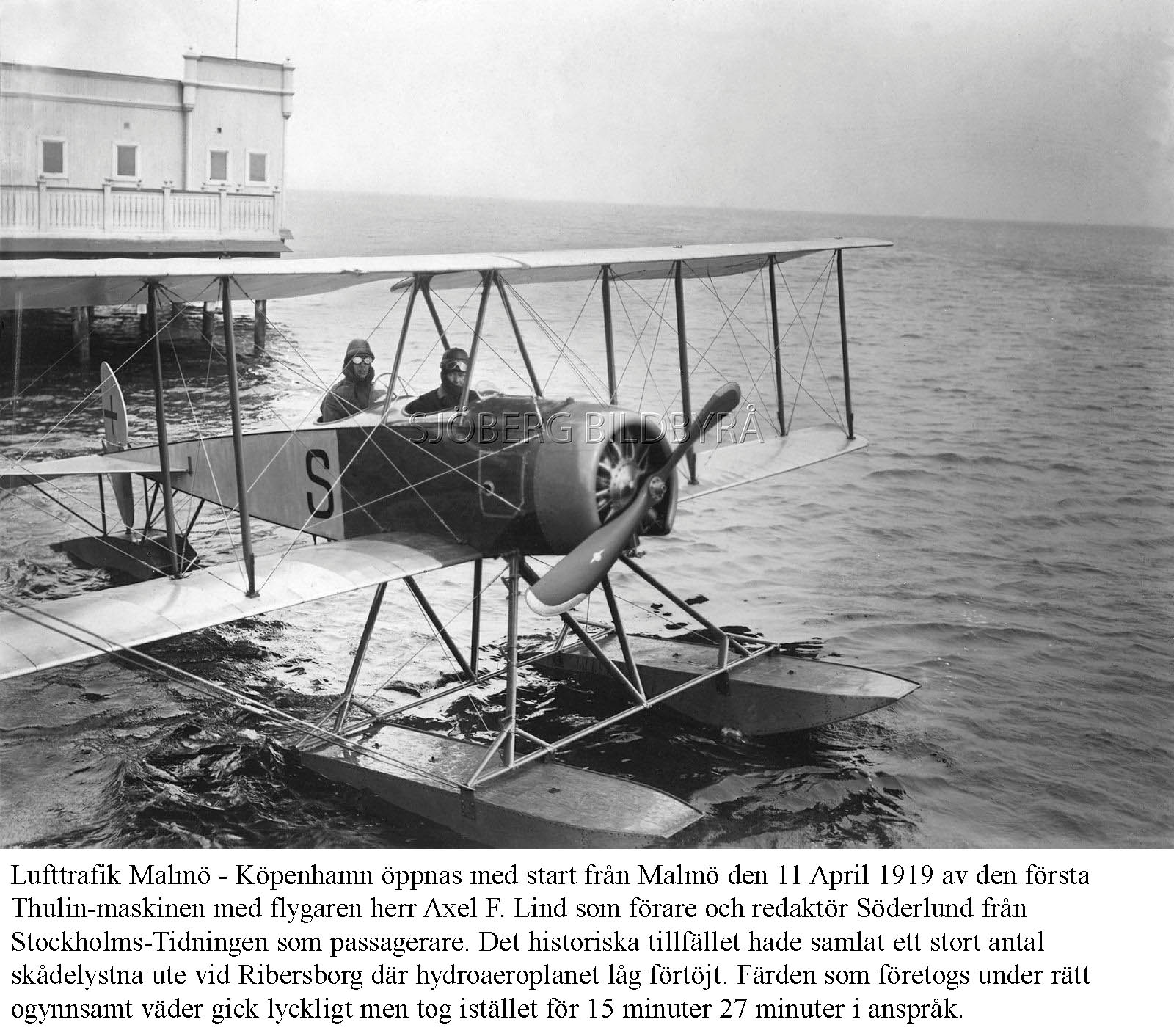 Bilden föreställer Kallbadhuset i Malmö i forna dagar. Flygplanet är ett tvåsitsigt Thulin LA på flottörer från Malmö Flygkompani, som bedrev passagerarflyg mellan Malmö - Köpenhamn 1919 under flygutställningen i Köpenhamn 12 - 26 april.